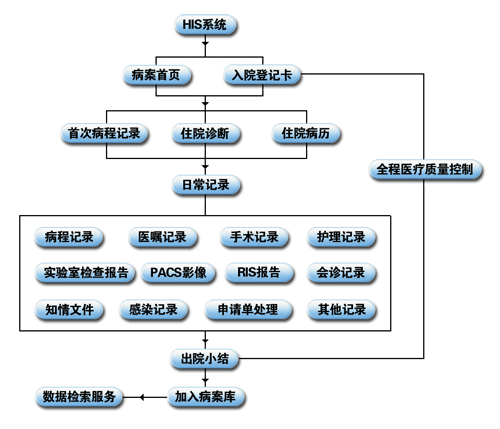 整套产品建立在病人信息这条主线上,利用本身所具备的强大的医学术语库,可自由扩展出各类医疗记录子系统,如已内置的住院病历采集子系统、病程记录采集子系统、手术记录子系统、护理记录子系统等等,同时,也可方便地扩展出其他医疗记录采集子系统;同时,利用其接口标准,可以方便地与现有HIS系统、RIS系统、PACS系统等各类子系统进行数据交换与数据采集,从而达到以病人信息为中心的中心数据采集的目的。